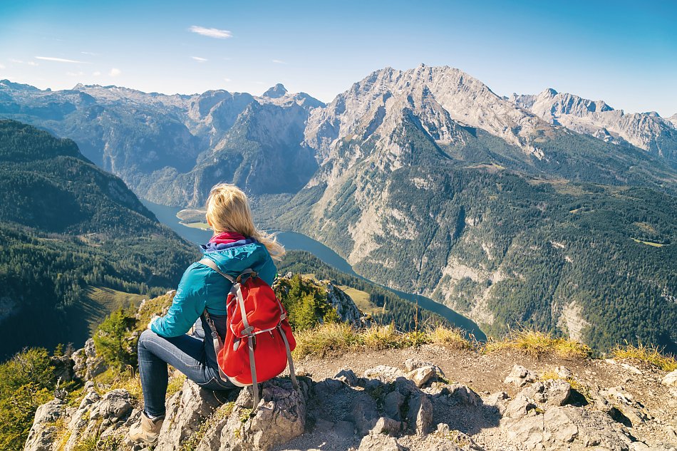 Kurze Bahnfahrt und Aufstieg in ein traumhaft einsames Waldgebiet. Panoramareiche Höhenwege geleiten Sie den Berghang entlang mit Ausblick auf Watzmann, Steinernes Meer und Hochkönig. Ein kurzes Stück am Soleleitungsweg, bevor Sie durch den Wald zum Grünstein aufsteigen. Tief unten leuchtet der grüne Königssee mit Bootshäusern und Schiffchen, das malerische Ziel Ihrer Wanderwoche inmitten des Nationalparks Berchtesgaden.