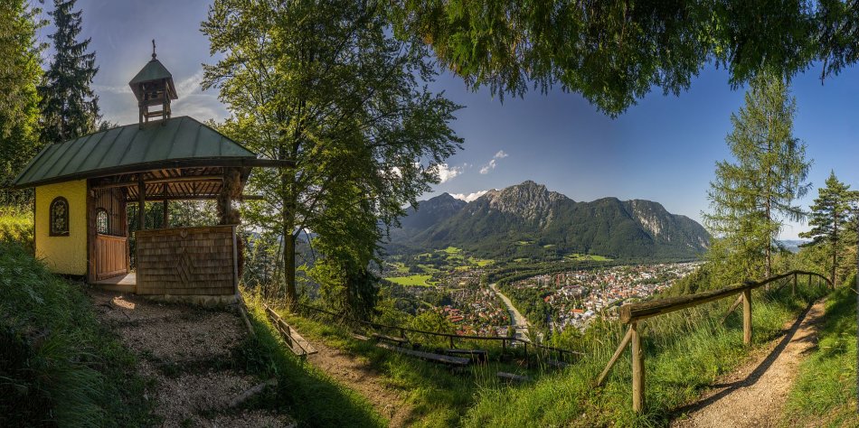 Eine luftige Seilbahnfahrt bringt Sie auf den Hochfelln, wo Sie das Taborkircherl und das eindrucksvolle Gipfelkreuz besuchen und eine fantastische Aussicht in die Zentralalpen genießen. Über Almen und Forstwege geht es hinab in den mystischen Märchenwald. Bald darauf erreichen Sie Ruhpolding, den beliebten Ferienort inmitten der Chiemgauer Alpen.
